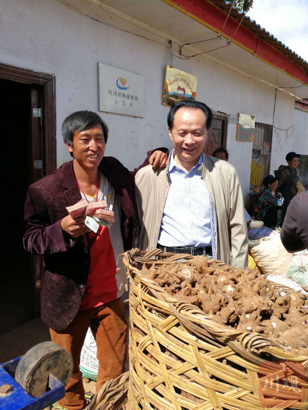 于是,便有了第二張照片。這張照片拍攝于2019年,布拖縣樂(lè)安鎮(zhèn)火燈村村民馬查力爾靠在耿福能的肩頭,笑著舉起手中的一沓鈔票。那一年,在中醫(yī)藥產(chǎn)業(yè)扶貧模式助推下,火燈村一舉摘掉窮帽,曾經(jīng)的貧困戶馬查力爾靠著種植附子住上新房子,過(guò)上好日子。當(dāng)年9月,耿福能帶隊(duì)到火燈村收貨,馬查力爾扛去兩大包附子,換來(lái)厚厚一沓鈔票。